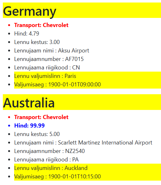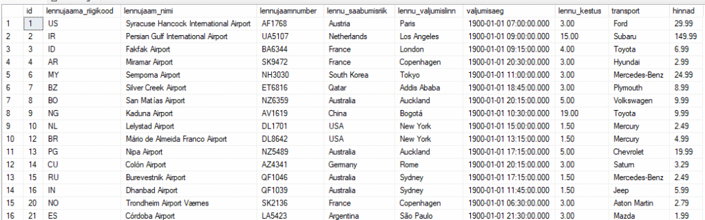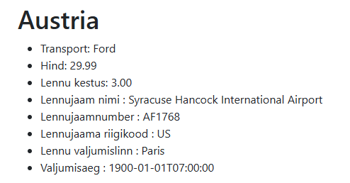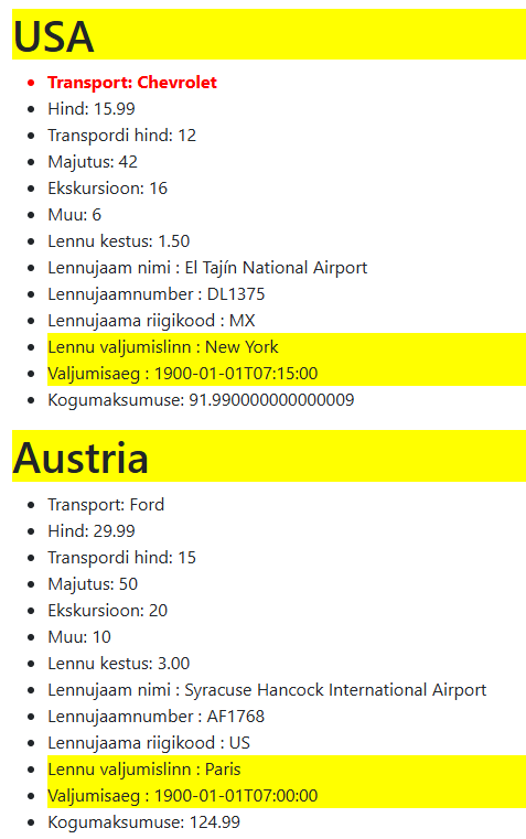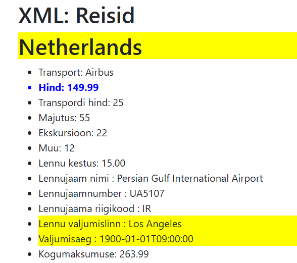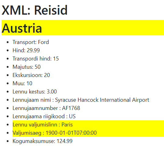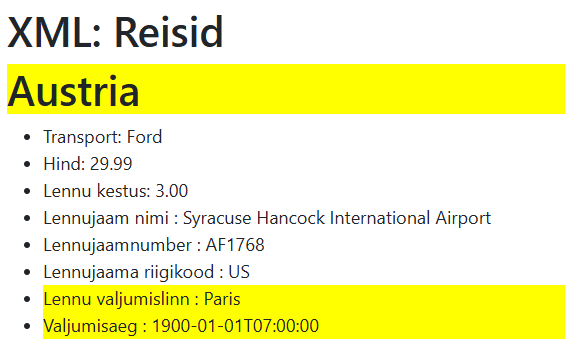 Ma seadistasin sõitude filtreerimise nii, et kuvataks ainult need, mille atribuut transport sisaldab sõna „Air”. Selleks muutsin failis reis.xml mõnede transpordivahendite väärtused „Airbus”-iks.