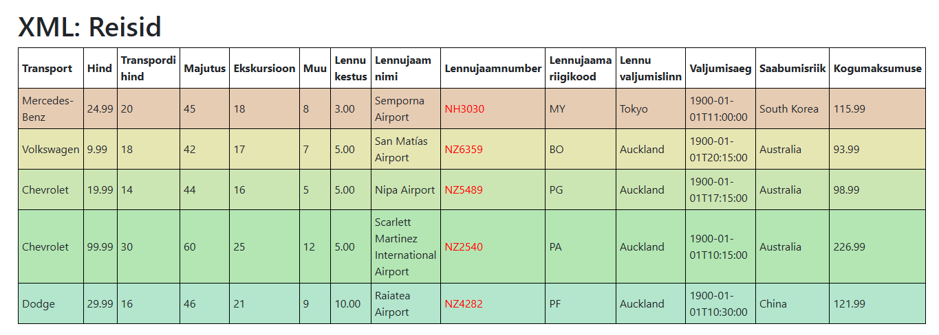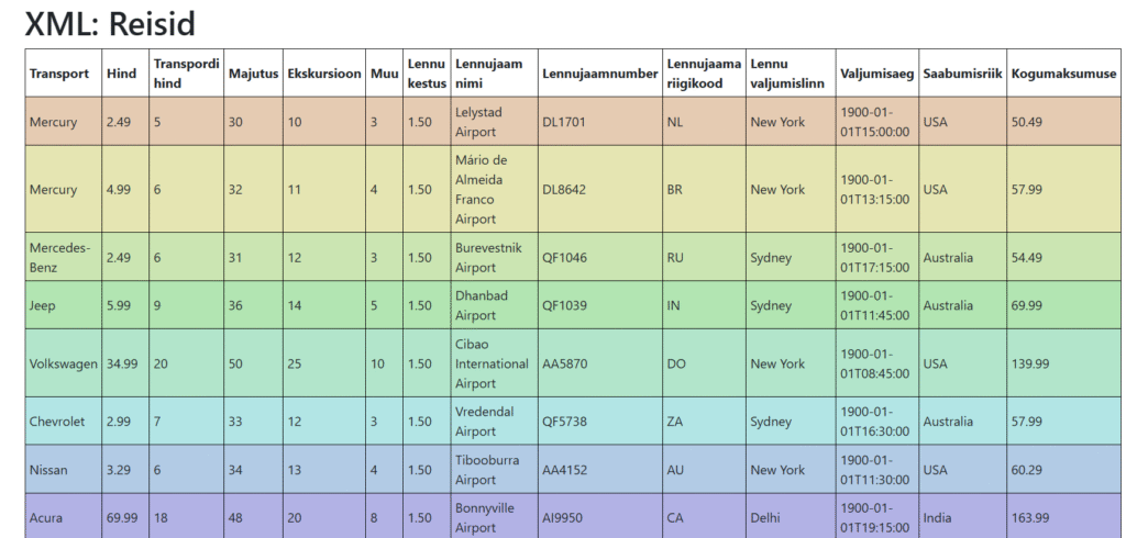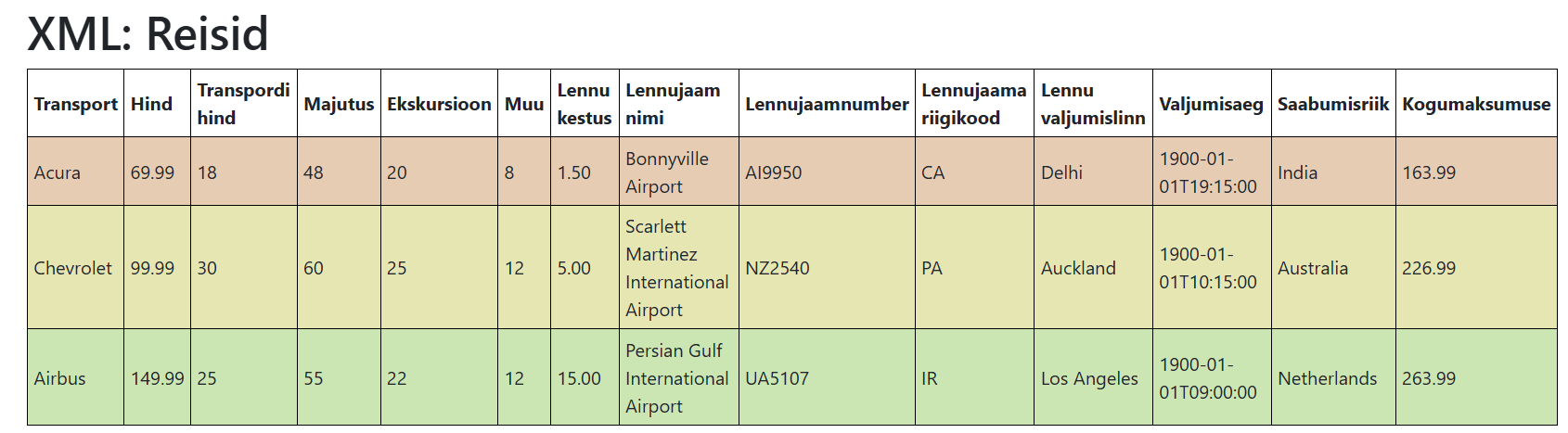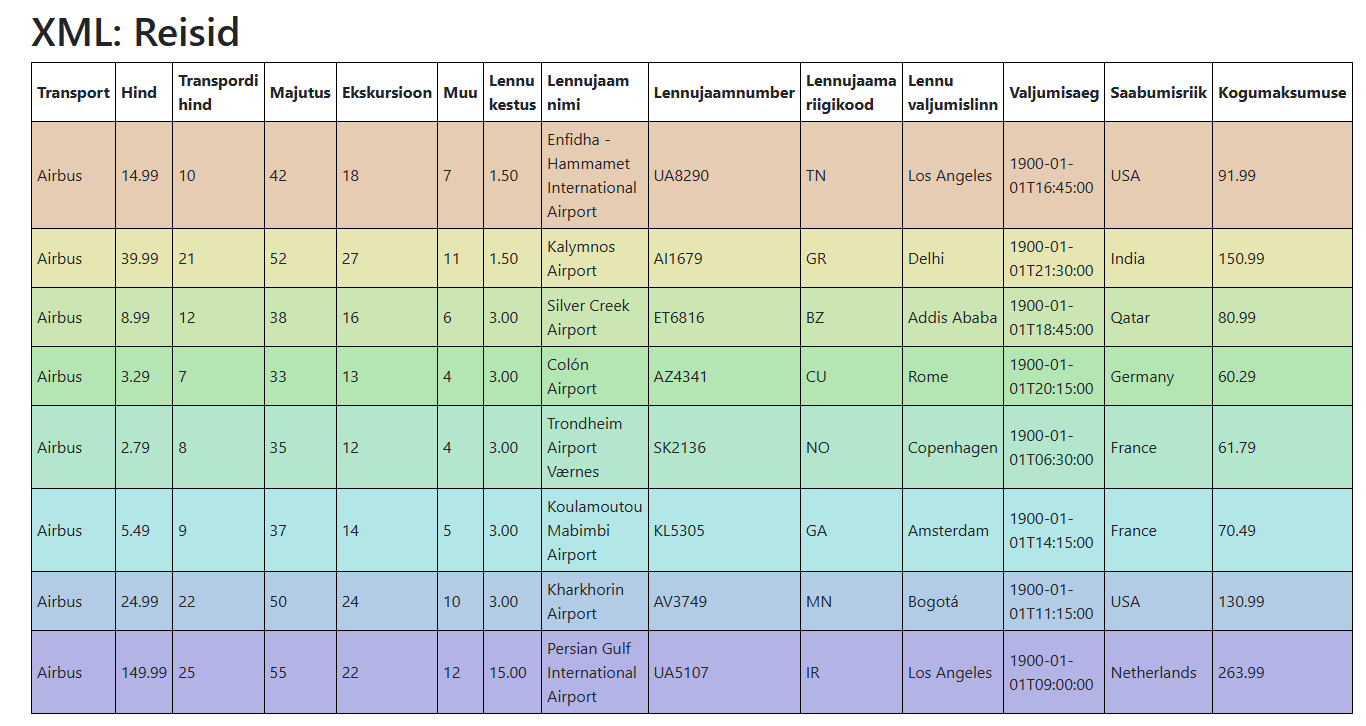 8. Kuva kõik xml andmed tabelina, kus read on üle rea erineva värviga.